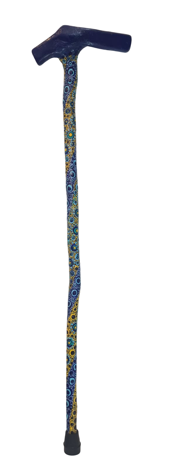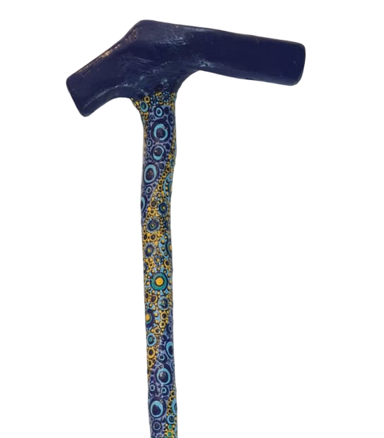 Since I can’t draw, I just do dots and lines. I have absolutely no idea where the designs come from, they just emerge from the juxtaposition of colors and the process of losing myself in the process. About 90% of my painting is done with toothpicks and sawed-off paint brush handles. My favorite base colors (upon which I apply the lines and dots) are dark green, dark blue, purple, and black. I use Mexican built chairs and I just follow the shapes of the wood. I never start with a design in mind. Often, about 1/3 of the way in, I get a strong feeling that the work isn/t working. I have learned to smile because they always explode into more beautiful patterns and designs. As a result, I have no fear of “mistakes”.