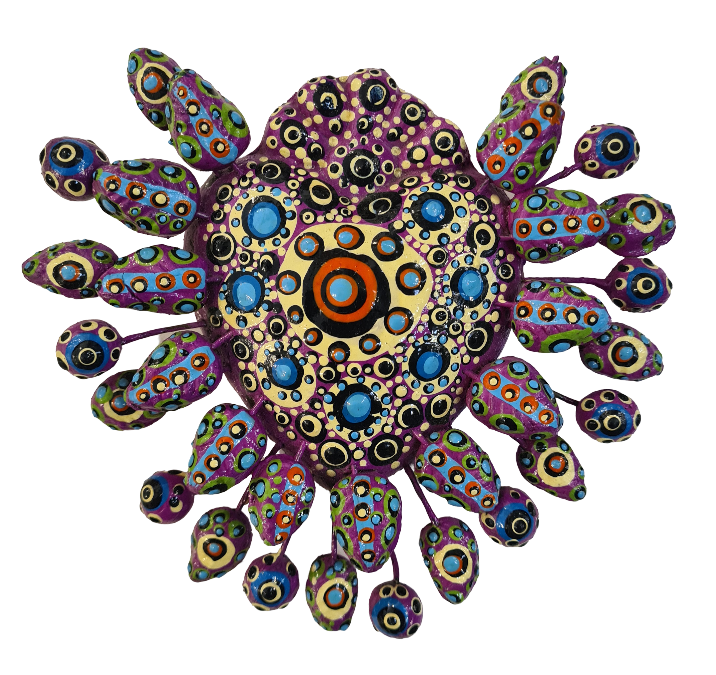 Los colores de mi trabajo celebran a México, tratando de reflejar el corazón de la cultura mexicana: una mezcla entre los indígenas huicholes (hilos de colores brillantes presionados sobre cera de abeja) y los tradicionales alebrijes oaxaqueños (animales de madera tallados y pintados con puntos). ). ). de colores brillantes). Estos “Corazones” o Corazones celebran mi regreso a una tierra, cultura, gente y lugar que amo. Nunca he sido más feliz y mi pintura expresa mi “alegría”, ¡mi alegría! Cada Corazón está pintado a mano con palillos de dientes, un proceso que lleva mucho tiempo y produce felicidad. “Colores de Mi Corazón” es el nombre que elegí para mi trabajo.