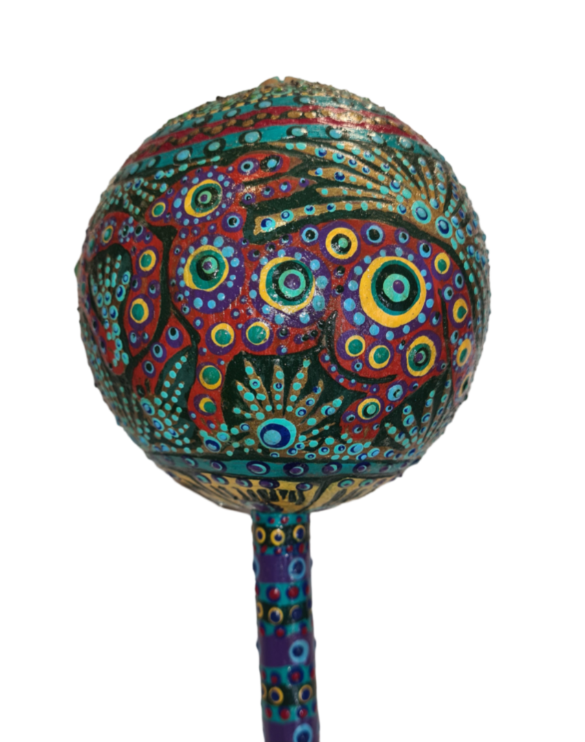 Como no puedo dibujar, sólo hago puntos y líneas. No tengo ni idea de dónde vienen los diseños, simplemente surgen de la yuxtaposición de colores y del proceso de perderme en el proceso. Aproximadamente el 90% de mi pintura la hago con palillos de dientes y mangos de pincel recortados. Mis colores base favoritos (sobre los que aplico las líneas y los puntos) son el verde oscuro, el azul oscuro, el morado y el negro. Utilizo sillas de construcción mexicana y solo sigo las formas de la madera. Nunca empiezo con un diseño en mente. A menudo, alrededor de 1/3 del camino, tengo una fuerte sensación de que el trabajo no está funcionando. He aprendido a sonreír porque siempre explotan en patrones y diseños más bellos. Como resultado, no tengo miedo de cometer “errores”.