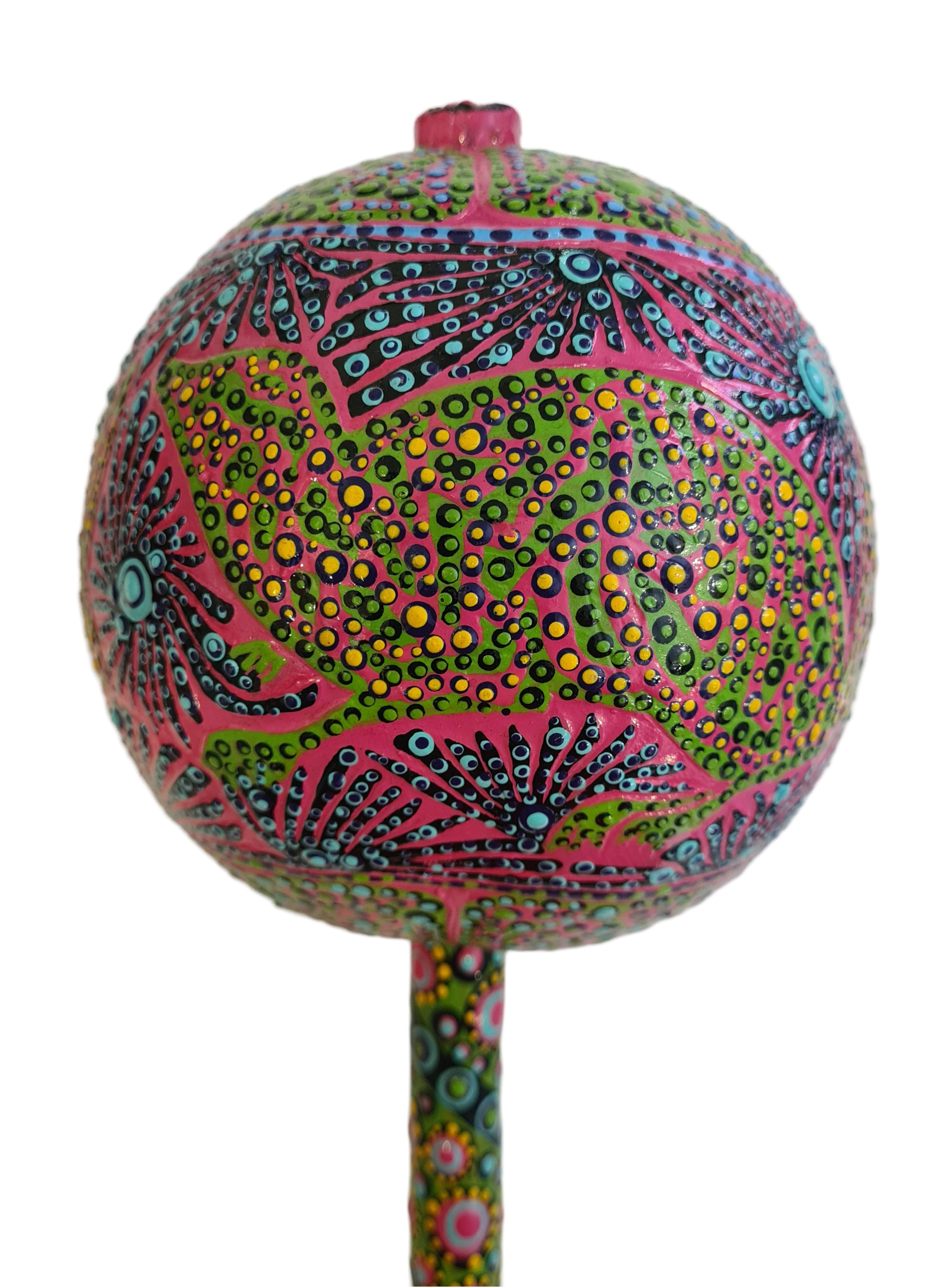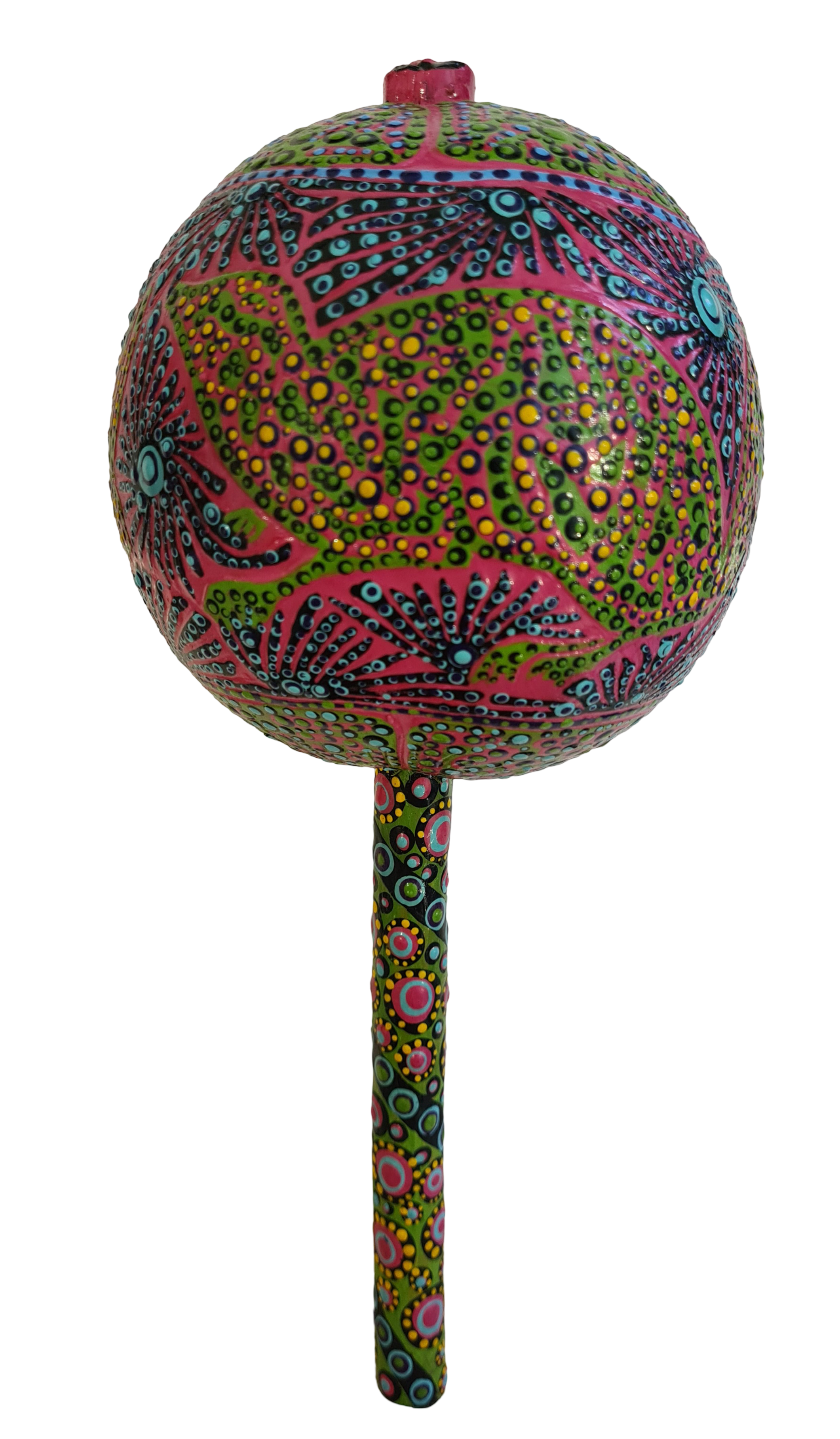 The colors of my work celebrate Mexico, trying to reflect the heart of Mexican culture – a blend between Huichol (brilliantly colored yarns pressed onto bees wax) and Alebrijes (brilliantly colored dot painted carved wooden animal figures).  “Colores de Mi Corazon” (Colors of  My Heart) is the name I chose for my work.