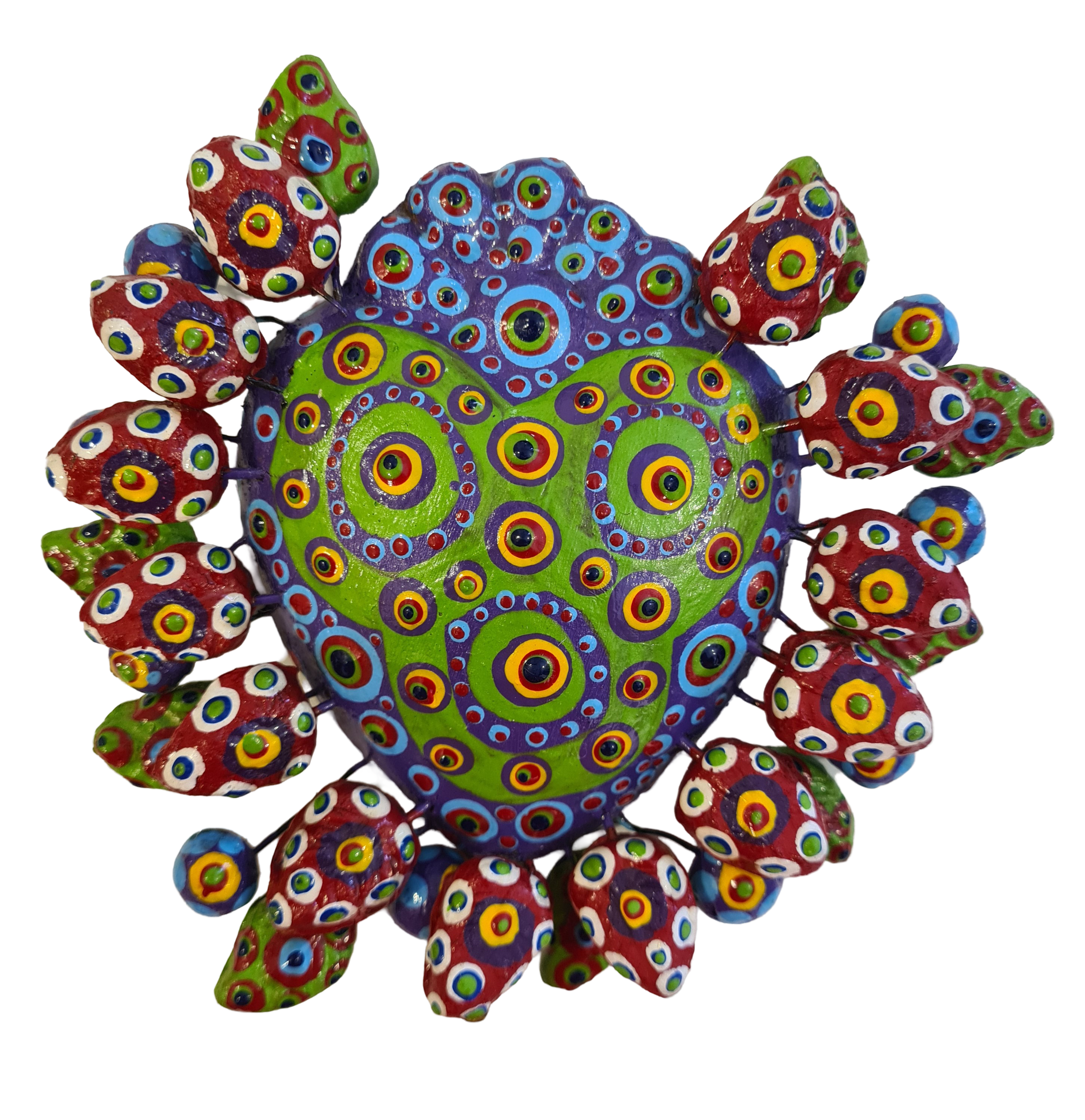 Los colores de mi trabajo celebran a México, tratando de reflejar el corazón de la cultura mexicana: una mezcla entre los indígenas huicholes (hilos de colores brillantes presionados sobre cera de abeja) y los tradicionales alebrijes oaxaqueños (animales de madera tallados y pintados con puntos de colores brillantes). Estos “Corazones” o Corazones celebran mi regreso a una tierra, cultura, gente y lugar que amo. Nunca he sido más feliz y mi pintura expresa mi “alegría”, ¡mi alegría! Cada Corazón está pintado a mano con palillos de dientes, un proceso que lleva mucho tiempo y produce felicidad. “Colores de Mi Corazón” es el nombre que elegí para mi trabajo.