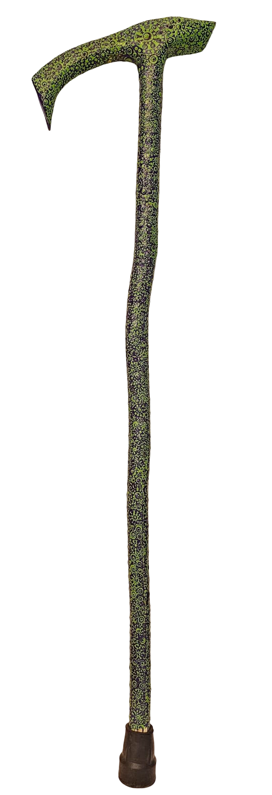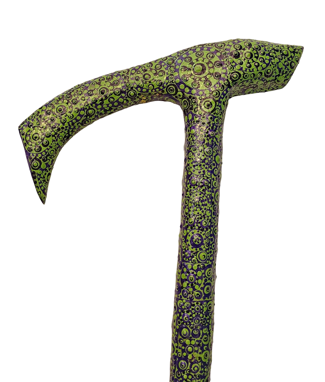 Since I can’t draw, I just do dots and lines. I have absolutely no idea where the designs come from, they just emerge from the juxtaposition of colors and the process of losing myself in the process. About 90% of my painting is done with toothpicks and sawed-off paint brush handles. My favorite base colors (upon which I apply the lines and dots) are dark green, dark blue, purple, and black. I use Mexican built chairs and I just follow the shapes of the wood. I never start with a design in mind. Often, about 1/3 of the way in, I get a strong feeling that the work isn/t working. I have learned to smile because they always explode into more beautiful patterns and designs. As a result, I have no fear of “mistakes”.