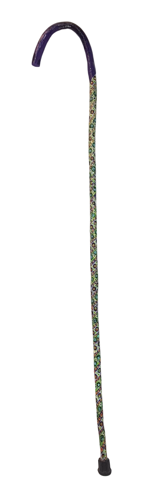 Since I can’t draw, I just do dots and lines. I have absolutely no idea where the designs come from, they just emerge from the juxtaposition of colors and the process of losing myself in the process. About 90% of my painting is done with toothpicks and sawed-off paint brush handles. My favorite base colors (upon which I apply the lines and dots) are dark green, dark blue, purple, and black. I use Mexican built chairs and I just follow the shapes of the wood. I never start with a design in mind. Often, about 1/3 of the way in, I get a strong feeling that the work isn/t working. I have learned to smile because they always explode into more beautiful patterns and designs. As a result, I have no fear of “mistakes”.
