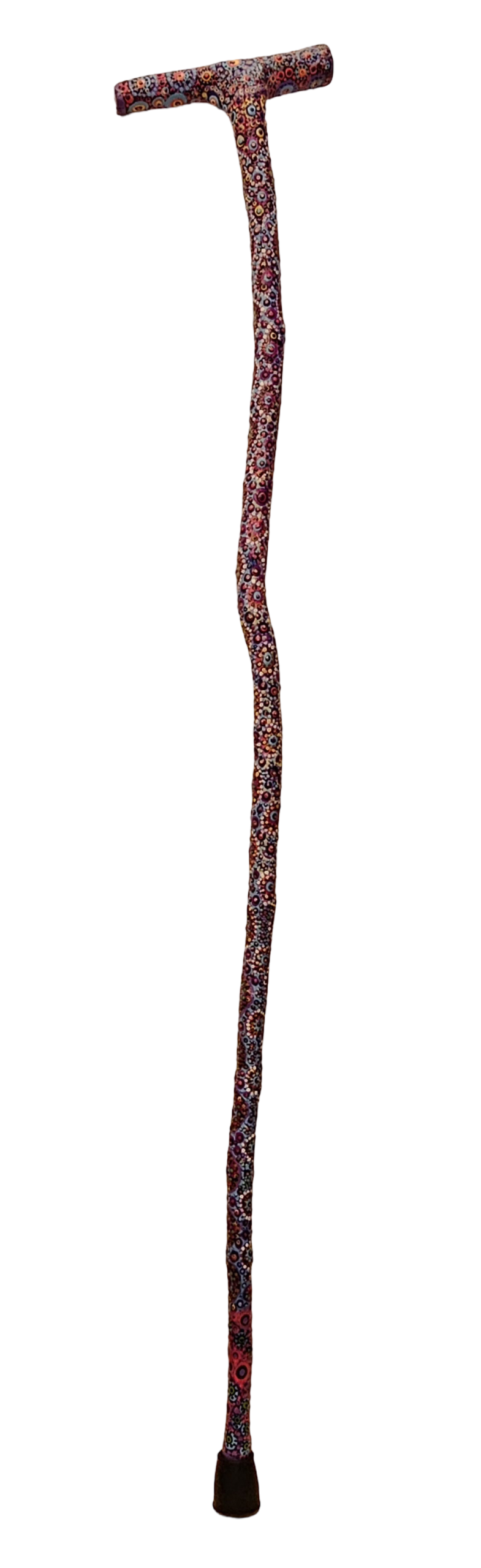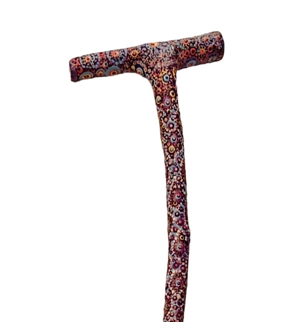 Since I can’t draw, I just do dots and lines. I have absolutely no idea where the designs come from, they just emerge from the juxtaposition of colors and the process of losing myself in the process. About 90% of my painting is done with toothpicks and sawed-off paint brush handles. My favorite base colors (upon which I apply the lines and dots) are dark green, dark blue, purple, and black. I use Mexican built chairs and I just follow the shapes of the wood. I never start with a design in mind. Often, about 1/3 of the way in, I get a strong feeling that the work isn/t working. I have learned to smile because they always explode into more beautiful patterns and designs. As a result, I have no fear of “mistakes”.